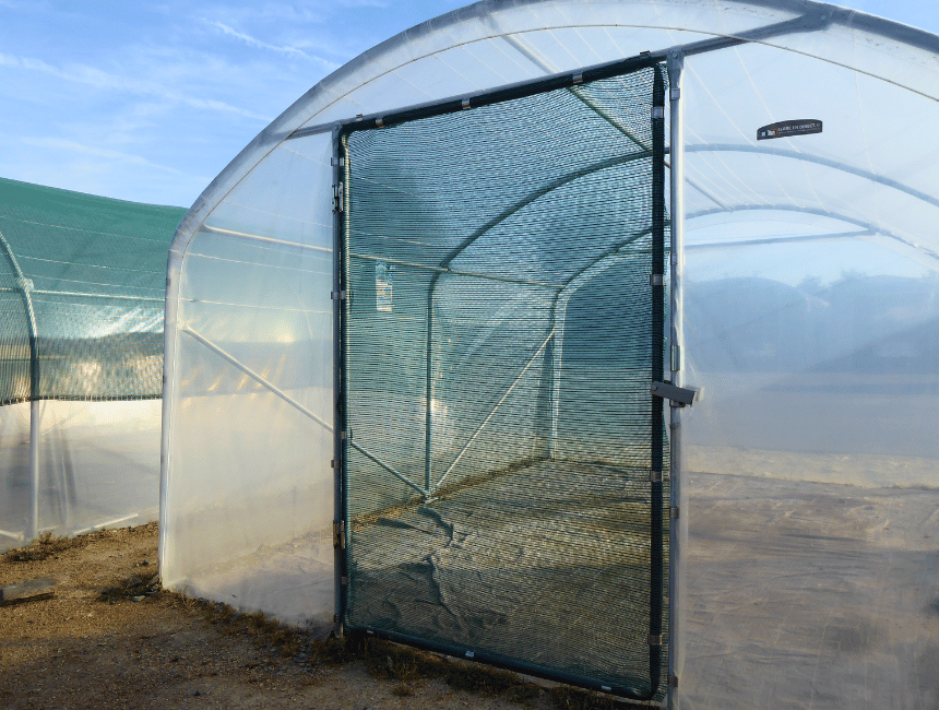 La pose d'un filet brise vent sur une porte de serre permet une ventilation de l'ensemble de la serre tout en fermant l'accès et en freinant les coups de vents.