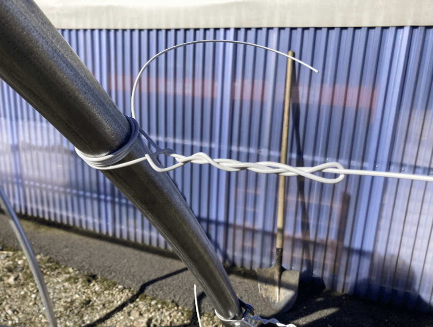 Pour contreventer la structure, un renfort en tube de 32 mm est fixé par deux colliers de 40 mm à chaque angle de la serre