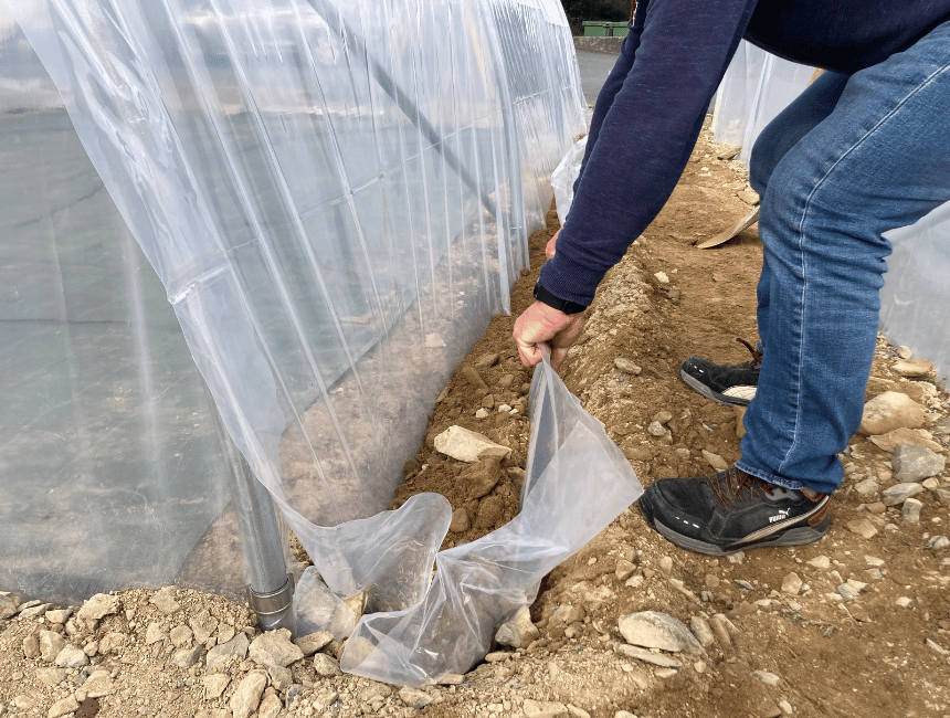 Les bâches sont livrées avec 75 cm minimum de surplus de chaque côté, afin de les tendre correctement et de les enterrer dans une tranchée.