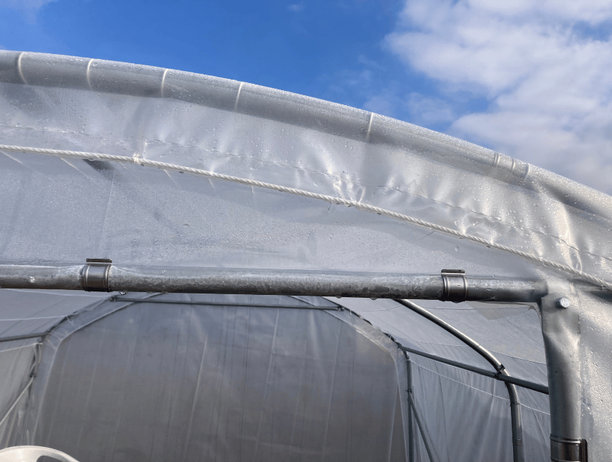 La bâche principale est livrée en une seule pièce, avec les cordelettes posées dans les ourlets à chaque extrémité de la serre.
