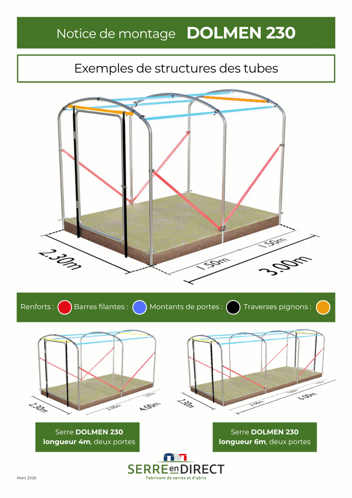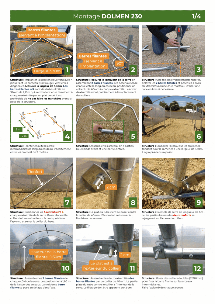Bonjour,Suite à l'achat de la serre dolmen 230 en 3M.Rien à dire sur la qualité générale de la serre qui est TOP.Cependant la notice même si elle est agrémentée de photos oublie qq détails de montage, il faut être quand même un peu équipé. Les vis auto-forantes sur un tube rond ne sont pas appropriées il faut un pré-perçage préalable.Les clips abiment malheureusement la bâche.Enfin le cadeau du ruban thermique est un peu un faux cadeau dans le sens ou ce ruban se déroule très mal le papier casse et rend la tâche longue et fastidieuse.Voilà en gros un gros TOP pour la serre montée mais un gros MOINS pour le montage et la notice.Belle journée à vous 1 personne(s) sur 4 ont trouvé ce commentaire utile.