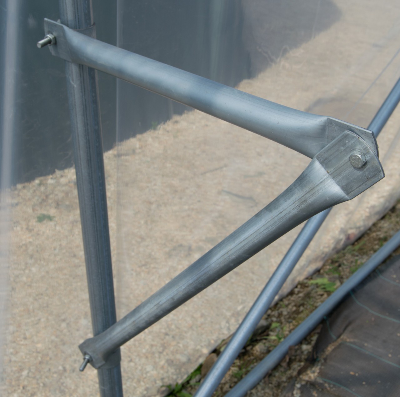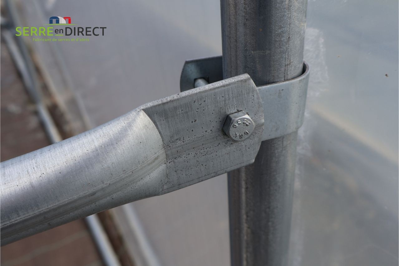 Dans le cas d'un montage dans une serre tunnel sans pieds droit il est nécessaire d'inverser la pose du jambage du support et de le fixer sur la partie haute de l'arceau comme le montre les deux photos ci-dessus.