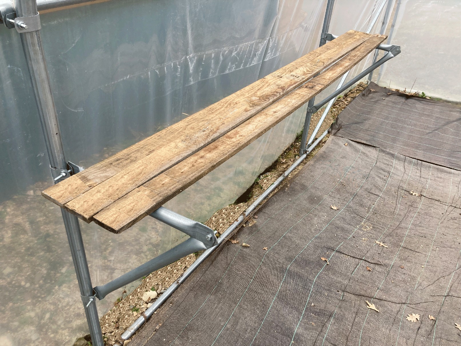 L'aménagement permet d'ouvrir la porte pour continuer à ventiler la serre. Il permet surtout un gain de place important en hauteur pour poser à l'abri des limaces des pots et plaques de semis. Il faut juste prévoir les colliers adaptés dans le cas présent 4 colliers en 32mm et 4 colliers en 40mm.