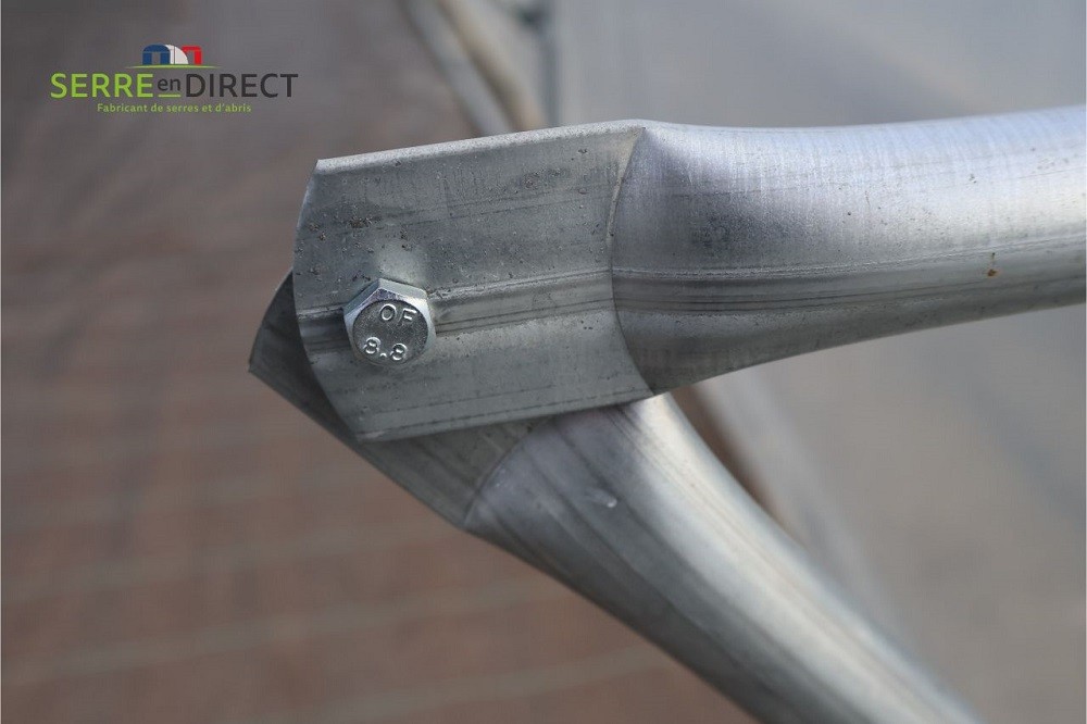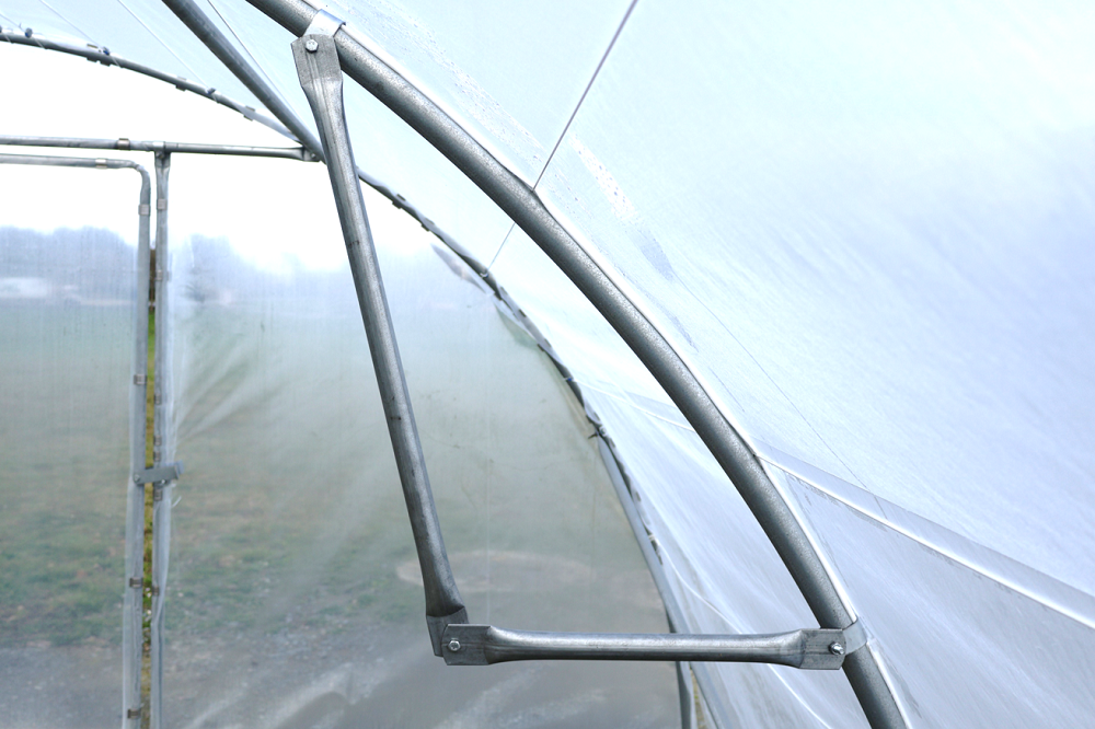 Dans le cas d'un montage dans une serre tunnel sans pieds droit il est nécessaire d'inverser la pose du jambage du support et de le fixer sur la partie haute de l'arceau comme le montre les deux photos ci-dessus.